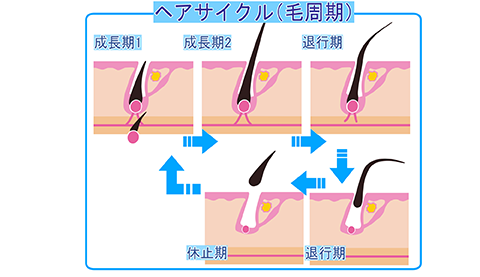 「成長期」は活発に毛を延ばしている期のこと。「退行期」は、成長が止まり毛が縮れてきている期のこと。「休止期」は、次の毛根ができるまでの準備期間のことです。